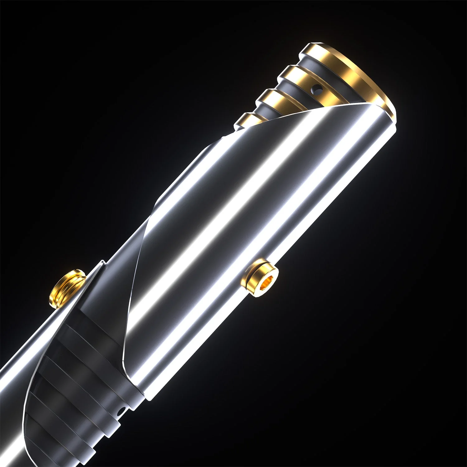 With its smooth, polished silver hilt accented by bold gold highlights, the Depa saber exudes elegance and strength. The slim profile and carefully contoured grip ensure comfort and control, making it as functional as it is visually stunning. The open design near the emitter adds a unique flair, setting it apart from traditional saber designs.